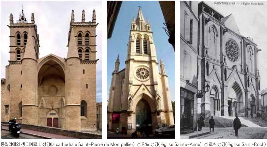 3) 몽펠리에의 성 안느 성당은 1562년 종교전쟁으로 절반 정도가 파손되어 17세기에 복원되었다. 이후 성당 확장을 위해 1866년에 재건축을 시작하여 1869년에 완공되었다. 전형적인 네오고딕 성당으로, 69m에 이르는 중앙 종탑이 특징이다.