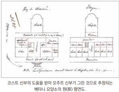 “1873년 6월에 오주프 신부는 르베디오스 씨에게서 그들이 얘기한 대지를 샀다. […] 보좌 신부였던 코스트 신부의 도움으로 오주프 신부는 즉시 새로운 (베타니) 요양소와 부속 성당의 설계도를 그렸다. (건축) 계획은 아주 열정적이었는데 홍콩과 극동 아시아 지역 최초의 요양소가 될 것으로 믿어 의심치 않았다. 그 시절에는 영국 식민지에서 건축 시공에 관한 어떤 특별한 규범이 없었다. 오주프 신부는 경제적인 이유로, 특히 공용 건물과 부속 성당의 설계는 그의 역량으로 가능해 보였으므로 결국 스스로 건축가가 되기로 결심하였다.”6)