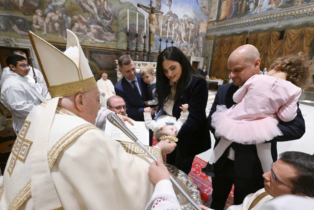 - 프란치스코 교황이 2024년 1월 7일 바티칸 시스티나 성당에서 아기에게 유아 세례를 주고 있다. CNS