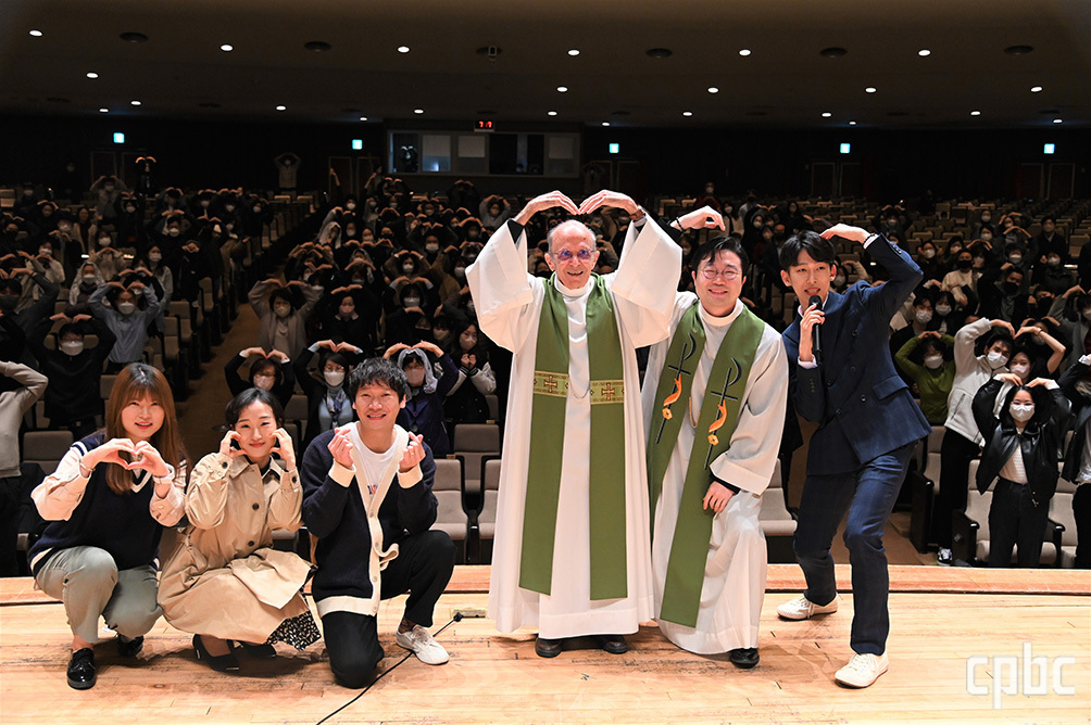 - 2022년 10월 26일 서울대학교 가톨릭공동체 연합회 초청으로 토크 콘서트에 나선 두봉 주교가 손으로 하트를 그려 보이고 있다.