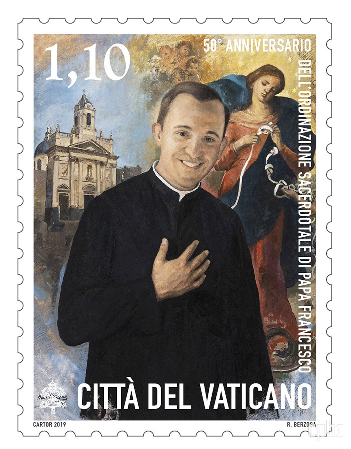 - 프란치스코 교황의 사제 서품 50주념 기념 우표, 우표에는 호르헤 마리오 베르골료 신부 시절의 모습이 담겨 있다. OSV