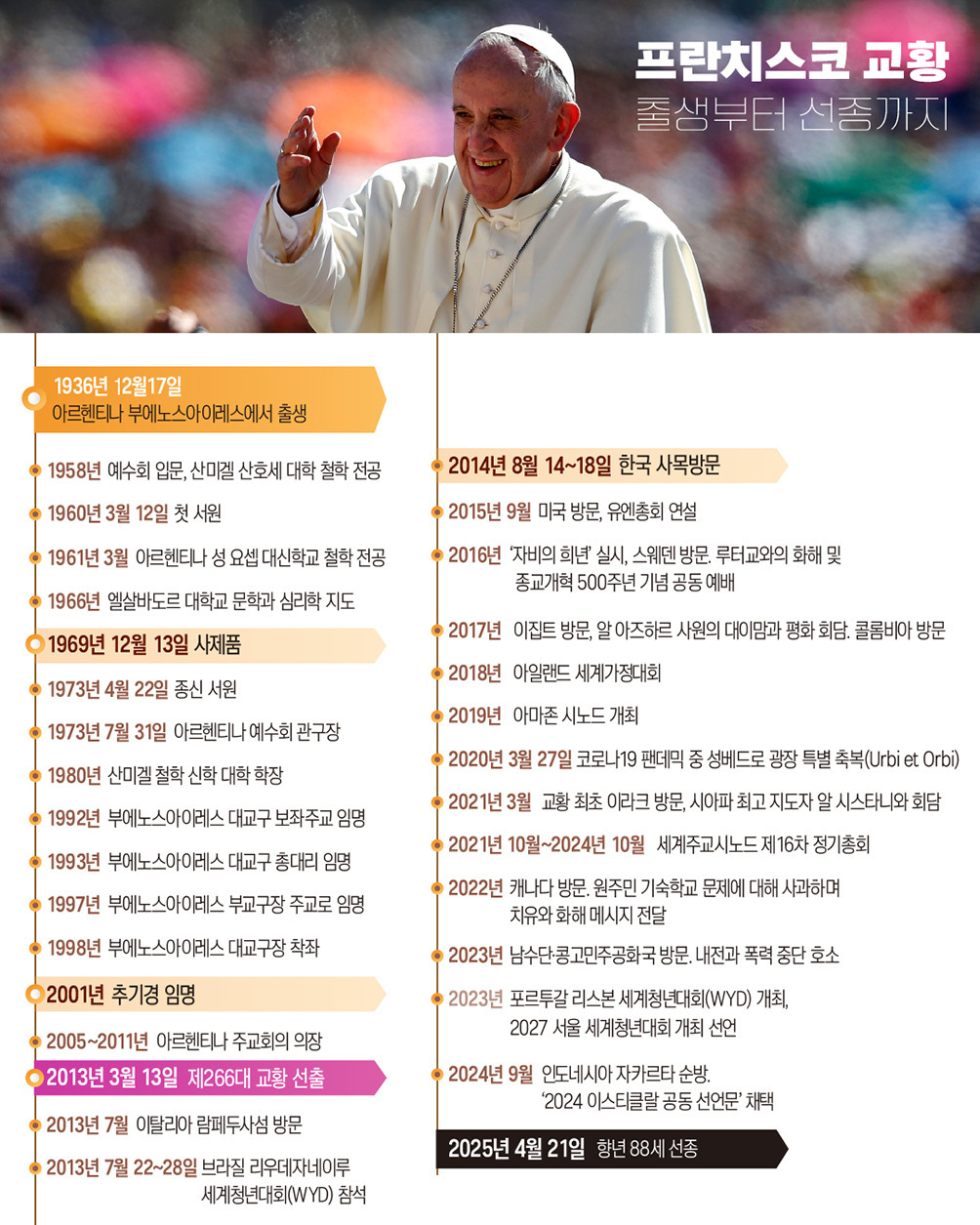 프란치스코 교황 탄생에서 선종까지 아르헨티나 이주민 아들로 태어나 교황으로 인간 존엄 · 공동체 회복 위해 쉼 없이 걷다